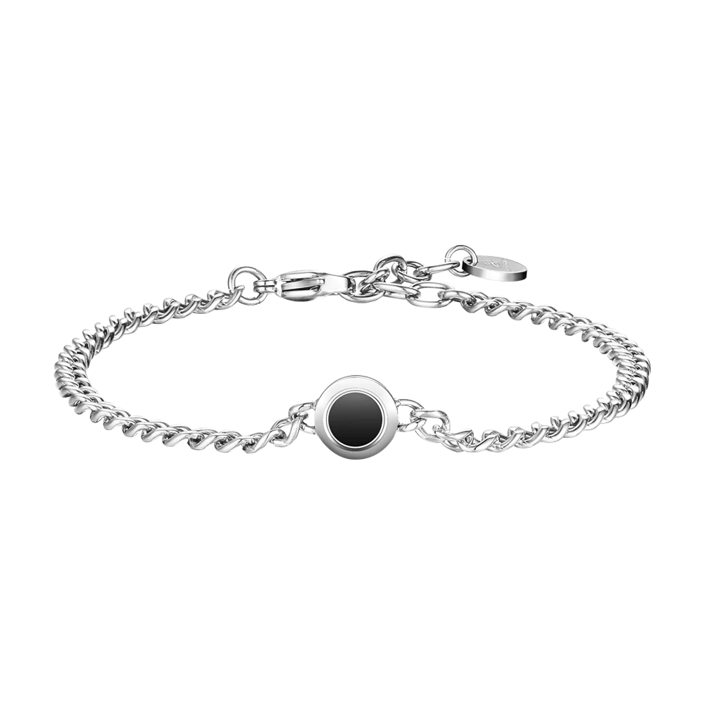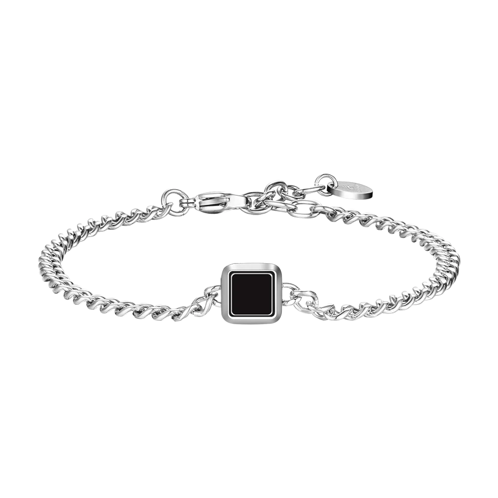 Bracciale in acciaio piastra con smalto nero Lunghezza: 19 + 3 cm Misura elemento: 9 x 9 mm. Lunghezza: 19+3 cm . Aggiungi un dettaglio minimal e sofisticato al tuo polso con questo bracciale decorato da un cerchio centrale. Ideale per chi ama la semplicità senza rinunciare allo stile.