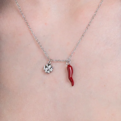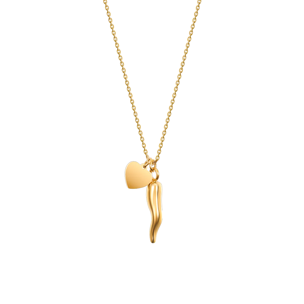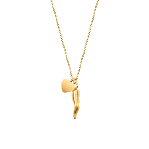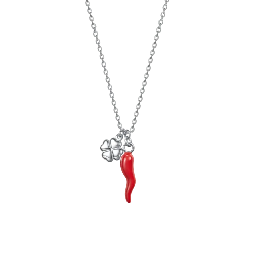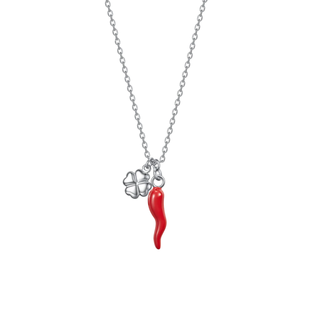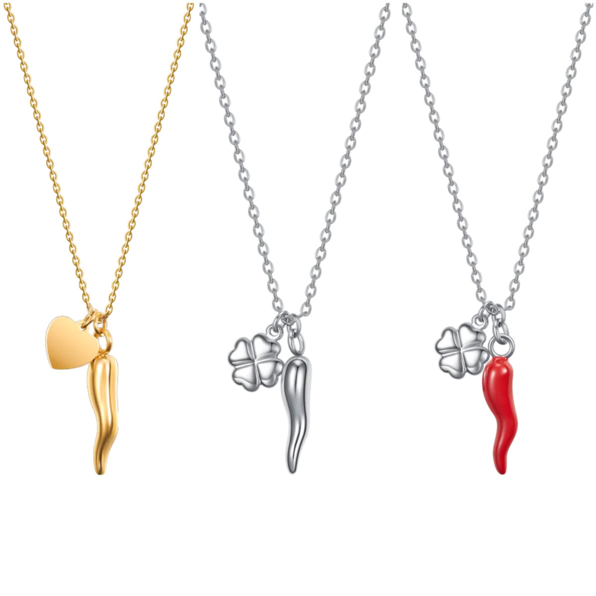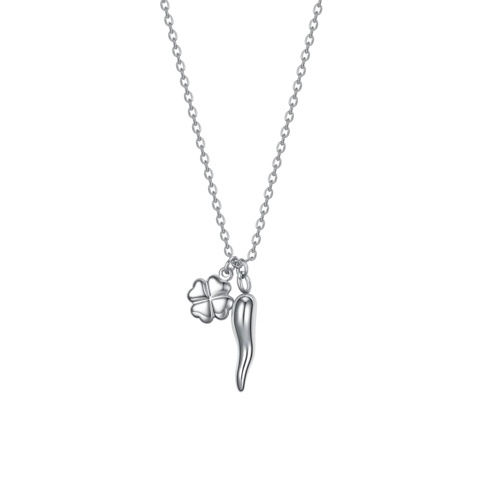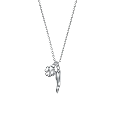 Collana donna in acciaio con corno e simbolo. Lunghezza: 40 + 5 cm Misura corno: 4,5 x 17 mm Misura cuore charm: 8 x 1,5 mm Aggiungi un tocco di fortuna e protezione al tuo look con questa collana elegante in acciaio. Il corno, simbolo di difesa, si unisce al quadrifoglio portafortuna, creando un gioiello raffinato e versatile da indossare ogni giorno
